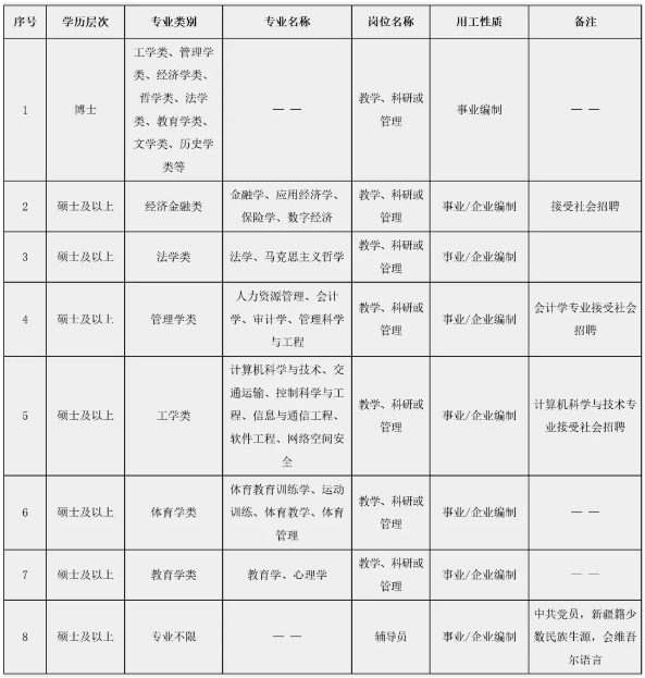 本年度人才招聘的学历层次、专业、岗位名称、用工性质等见下表: