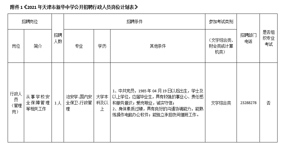 我校2021年拟招聘行政人员1名。详见附件1《2021年天津市新华中学公开招聘行政人员岗位计划表》。