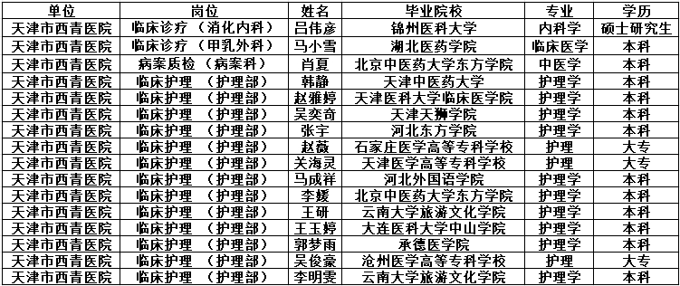 经本人报名,天津赛达人力资源开发有限公司组织考试后,根据其总成绩、体检、政审情况,确定如下人员为天津市西青医院2024年公开招聘编外派遣制工作人员拟录用人员,根据《天津市西青医院2024年面向社会公开招聘编外派遣制工作人员公告》中公示期的规定,现公示如下: