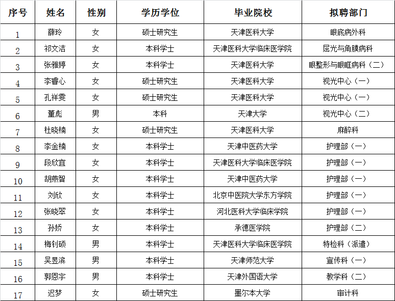 天津医科大学眼科医院2025年自主招聘拟聘用人员公示