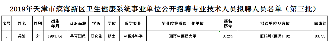 2019年天津市滨海新区卫生健康系统事业单位公开招聘专业技术人员拟聘公示(第三批)