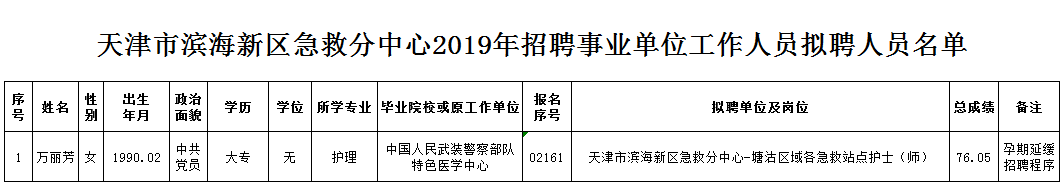 天津市滨海新区急救分中心于2019年6月5日发布了招聘公告,一名考生因孕期不能参加体检,暂缓招聘程序,现该考生已完成体检和考察程序。按照《天津市事业单位公开招聘人员实施办法(试行)》(津人社局发[2011]10号)要求,现将拟聘用人员予以公示。