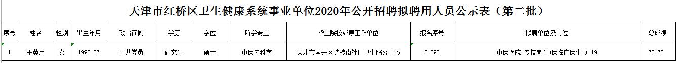 天津市红桥区卫生健康系统事业单位2020年公开招聘拟聘用人员公示(第二批)
