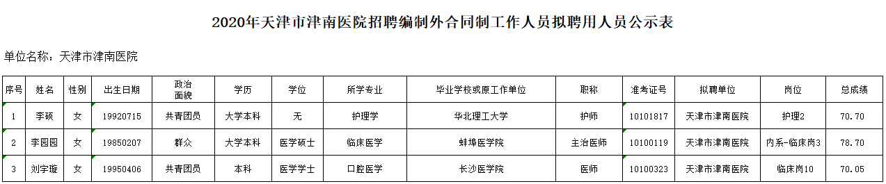 附件: 2020年天津市津南医院招聘编制外合同制工作人员拟聘用人员公示表