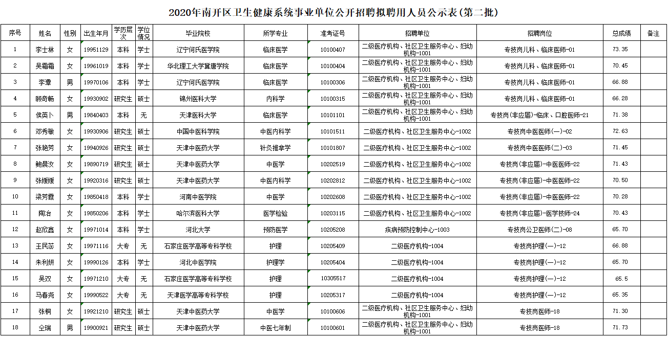 附:2020年南开区卫生健康系统事业单位公开招聘拟聘用人员公示表(第二批)
