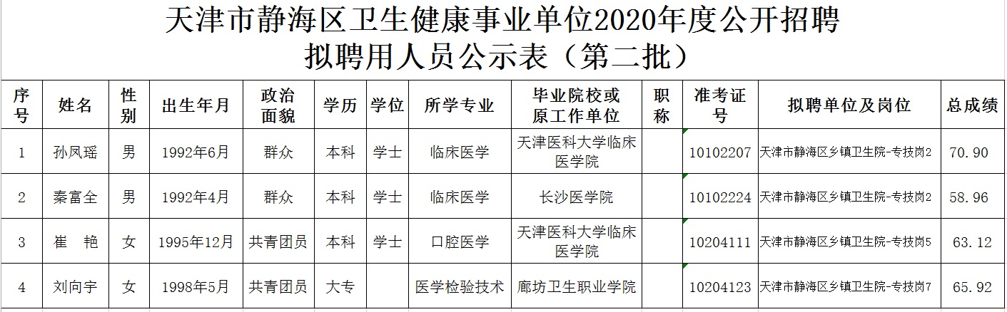 附:天津市静海区卫生健康事业单位2020年度公开招聘拟聘用人员公示表(第二批)