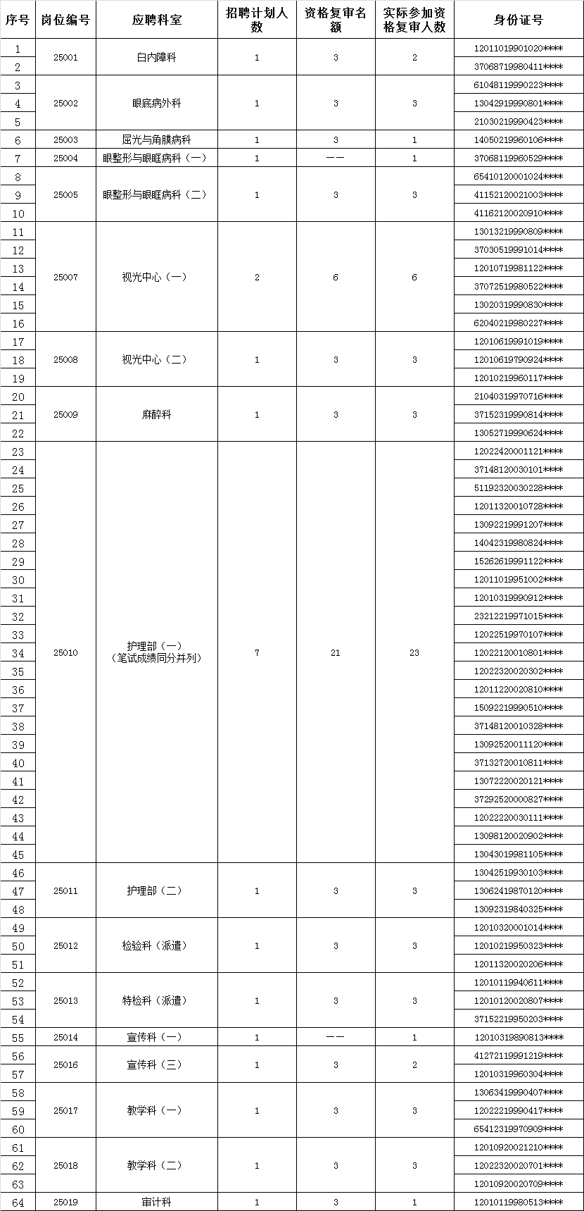 天津医科大学眼科医院2025年自主招聘进入资格复审人员名单