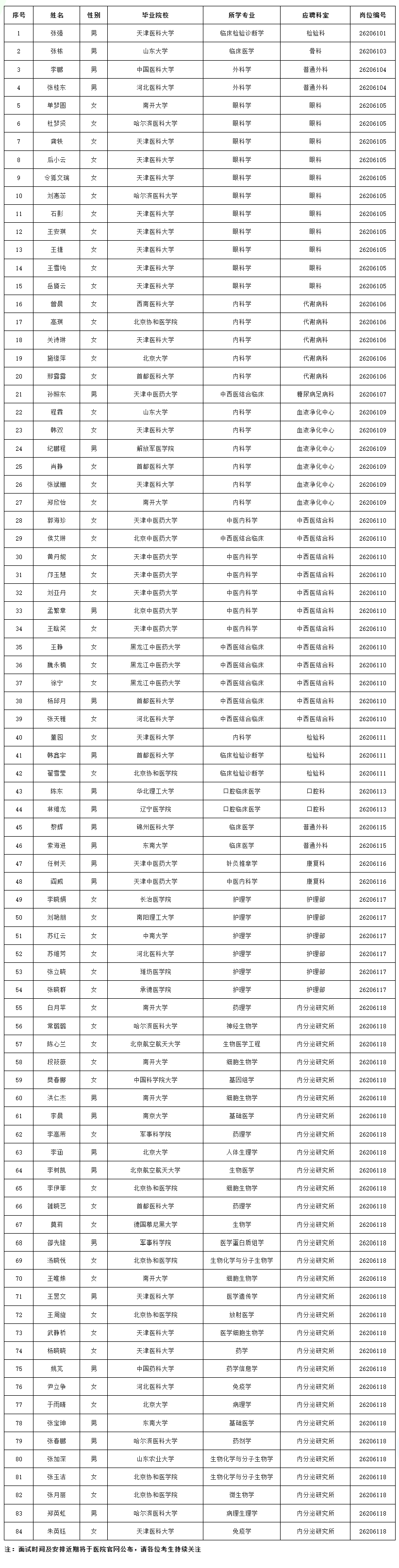 天津医科大学朱宪彝纪念医院2026年第一批公开招聘通过资格初审人员名单