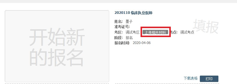 考生登录国家医学考试网(www.nmec.org.cn)报名系统, 查看个人报名信息,在报名信息处,点击「上传相关材料」按钮。如下图: