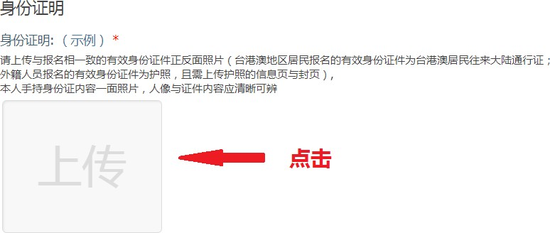 以身份证明上传为例,点击“示例”查看要求,再点“上传”按钮,进入上传图片界面,将个人已经准备好的图像文件上传。如下图: