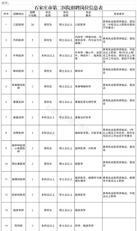 本次拟招聘工作人员共计51人。各岗位具体招聘人数和岗位条件详见《石家庄市第二医院招聘岗位信息表》。
