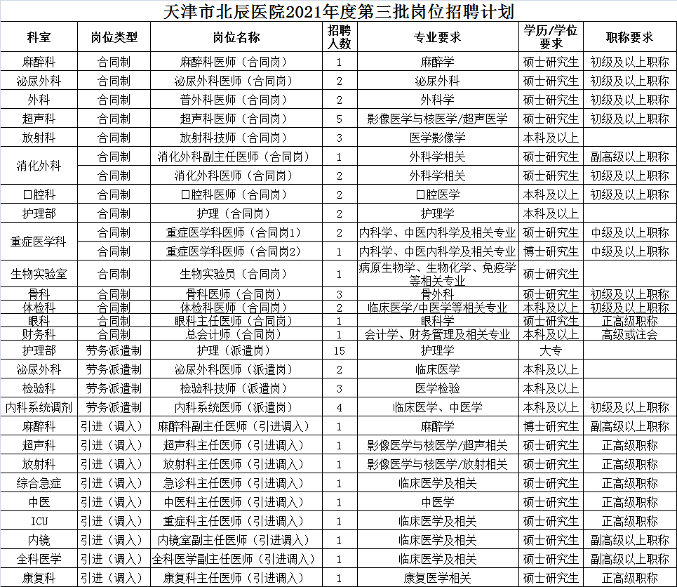 见《天津市北辰医院2021年度第二批岗位招聘计划》详细岗位描述及具体要求以报名系统中要求为准