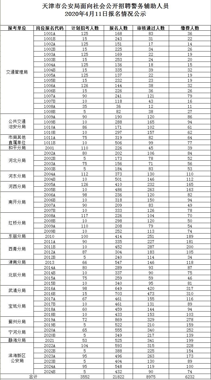 天津市公安局面向社会公开招聘警务辅助人员2020年4月11日报名情况公示