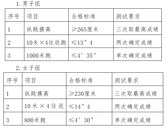 体能测评按照规定的标准和程序进行,进入体能测评人员按照与各岗位(代码)计划招聘人数4:l的比例,根据笔试成绩从高到低依次确定。达不到比例的,按照实际人数进行测评。体能测评采取单项淘汰方式进行,凡一项不达标的视为体能测评不合格。体能测评不合格的,不能进入面试;未按要求参加的,视为放弃资格。体能测评成绩将于测试当日进行公布,并由考生签字确认。