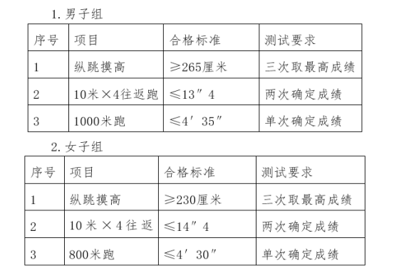 体能测评项目及合格标准如下: