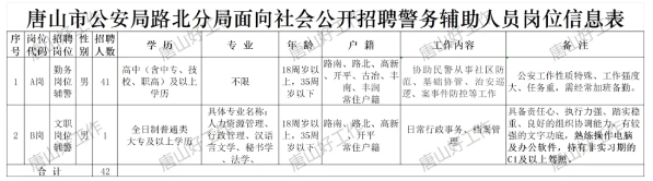 唐山市公安路北分局面向社会公开招聘42名警务辅助人员公告