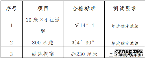 缺少上述任一审核材料的报考人员不得参加资格复审与体能测试;在规定集合时间内未进场点录人员记为缺考,不得参加资格复审与体能测试;报考人员在体测现场进行学历认证,凡弄虚作假者,一经发现,直接取消考试资格。体能测试采取单项淘汰方式进行,凡一项不达标的视为体能测试不合格。体能测试成绩将于测试当日进行公布,并由考生签字确认。